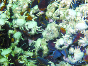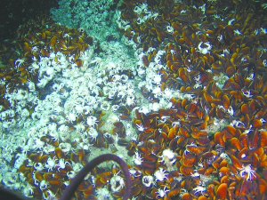 冷泉生物系統是指示海底冷泉非常直接的標志。甲烷氧化菌和硫酸鹽還原菌參與到冷泉流體中的甲烷與硫酸根離子的缺氧甲烷氧化反應中,為化能自養生物提供了碳源和能量,成為冷泉生態系的初級生產者。在其基礎上又發育著菌席和深海雙殼類(貽貝類和蛤類)及蠕蟲(管狀群蠕蟲和冰蠕蟲)多毛類動物以及海星、海膽、海蝦等一級消費者,其中管狀蠕蟲只出現在冷泉流速較低的環境。二級消費者有魚、螃蟹、扁形蟲、冷水珊瑚等。所以冷泉活動區域一般都是海底生命極度活躍的地方,和熱液生態系統并稱為“深海綠洲”。