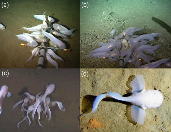 近些年,隨著國(guó)內(nèi)外深海探測(cè)技術(shù)發(fā)展,不斷有新物種相繼被發(fā)現(xiàn)。2008年,英國(guó)阿伯丁大學(xué)研究團(tuán)隊(duì)在日本海溝7,700米處發(fā)現(xiàn)一新的獅子魚;此后該團(tuán)隊(duì)還在克馬德克海溝7,000米以下拍攝到一組克馬德克隆背獅子魚攝食圖片(圖3)。從拍攝的圖片中可以看出,盡管深海環(huán)境十分惡劣,這些獅子魚卻展現(xiàn)出游刃有余的適應(yīng)能力。