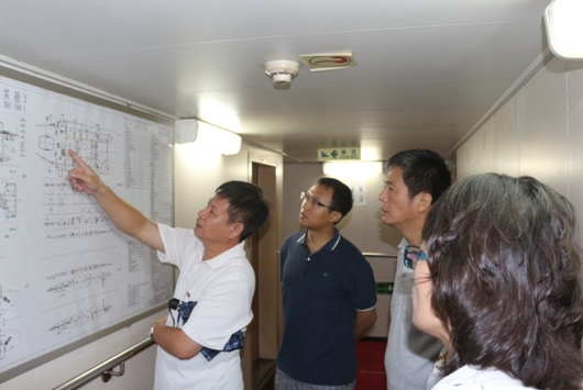 南海海洋研究所船舶處處長蔡小陽和“實驗1”號船長向三亞深海所科研人員詳細介紹了“實驗1”號的船舶結(jié)構(gòu)、建造過程、船載儀器設備以及各項參數(shù)性能。同時,大家針對船舶動力系統(tǒng)、減震降噪功能和綜合科學考察能力提出問題,進行了詳細咨詢了解。