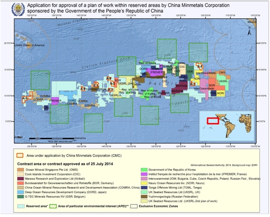 國際海底管理局理事會于牙買加當(dāng)?shù)貢r間2015年7月20日通過了中國五礦集團(tuán)公司(簡稱:中國五礦)提出的太平洋多金屬結(jié)核礦區(qū)(申請區(qū)域位于東太平洋克拉里昂-克利珀頓斷裂區(qū),表面積為72740平方公里)勘探申請。至此,中國五礦成為我國首個擁有國際海底礦產(chǎn)資源勘探權(quán)的企業(yè),也讓我國獲得了第四塊國際海底專屬勘探礦區(qū)。