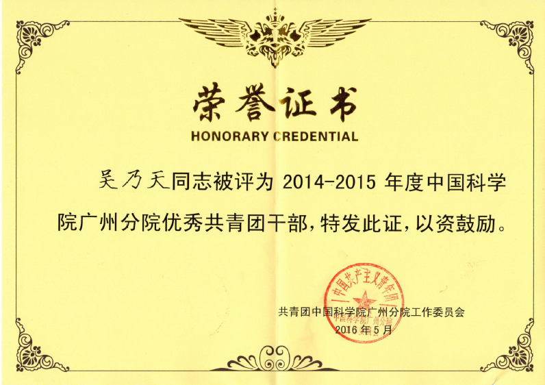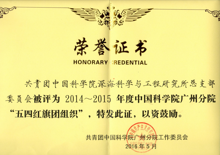 為進一步推進中國科學院廣州分院基層團組織的各項建設,增強團組織的凝聚力和戰斗力,引導團員、團干部積極投身實施 “率先行動”計劃,廣州分院團工委在“五四青年節”期間,表彰一批20142015年度廣州分院“五四紅旗團組織”、優秀團干部和優秀團員。深海所團總支部被評為“20142015年度中國科學院廣州分院五四紅旗團組織”,吳乃天同志被評為“20142015年度中國科學院廣州分院優秀共青團干部”。