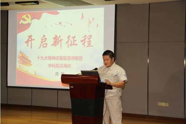 11月1日上午,中國科學(xué)院深海科學(xué)與工程研究所在十樓報告廳舉行黨的十九大精神宣講報告會,十九大代表周皓同志作宣講報告,全所成員近100人參加會議。