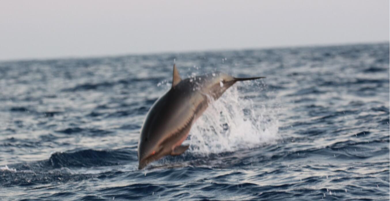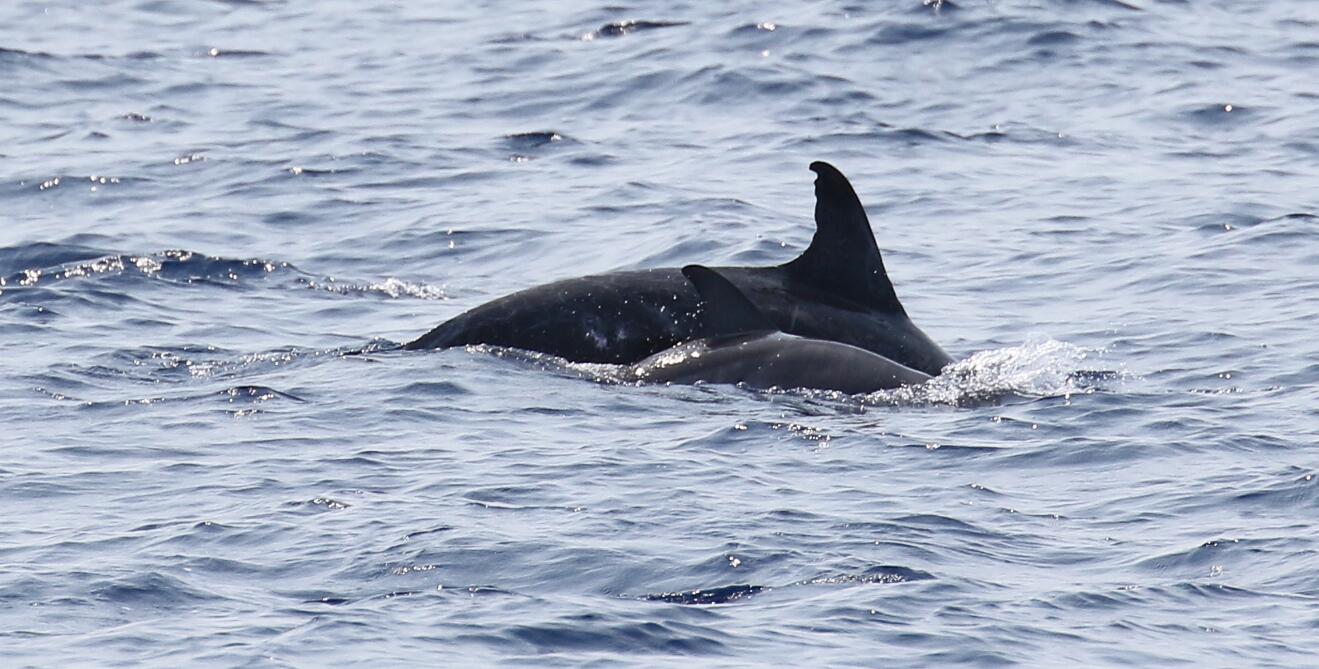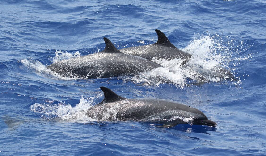 航次采用目視考察手段、截線抽樣方法,在海南島東南海域陸坡區(qū)域進行科學考察,以了解該區(qū)域深潛和遠海性鯨類物種組成、空間分布和行為特征。考察過程中,科考隊員在南海北部海域發(fā)現(xiàn)了大量的鯨類動物,一共目擊到深潛和遠海性鯨類動物27群次,其中可確定的深潛鯨類物種4種,分別為抹香鯨、柯氏喙鯨、短肢領(lǐng)航鯨、花紋鯨(瑞氏海豚);遠海性海豚物種3種,分別為熱帶斑海豚、條紋海豚、弗氏海豚。另有2個物種還有待進一步確定。考察結(jié)果顯示,考察海域目前擁有較高的深潛和遠海性鯨類物種多樣性;除熱帶斑海豚外,其它動物群體均是科研人員在考察海域的首次發(fā)現(xiàn)和記錄;其中,抹香鯨和喙鯨群體都觀察到母子對,表明南海北部考察海域極有可能存在抹香鯨和喙鯨的定居群體。這些發(fā)現(xiàn)填補了南海鯨類尤其是南海深潛鯨類研究的空白。