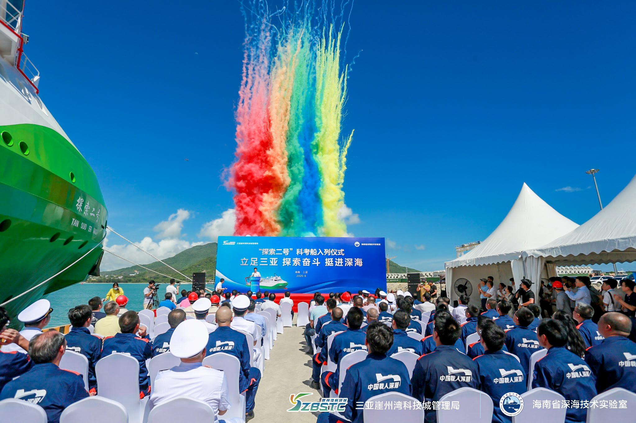 隨后,在南山港碼頭,三亞崖州灣科技城為 “探索二號”舉行隆重的入列儀式,船舶增改項(xiàng)目負(fù)責(zé)人唐古拉山向海南省人民政府副秘書長賴泳文匯報(bào):“探索二號”船完成改建研制工作,回到三亞,正式入列。賴泳文首先表示同意入列,并代表省政府,向奮戰(zhàn)在“探索二號”科考船改建一線的科技人員們表示衷心的感謝,賴泳文指出:“探索二號”的正式入列,將推動(dòng)海南逐步形成“雙船雙潛器”為主、系列無人深潛裝置為輔的深海科考重大裝備集群,在全世界海洋科技領(lǐng)域占據(jù)極為重要的位置。他希望我們在全力保障國家戰(zhàn)略需要的同時(shí),落實(shí)科技資源共享要求,繼續(xù)加大支持深海戰(zhàn)略產(chǎn)業(yè)發(fā)展,他指出:海南將一如既往地支持深海科技創(chuàng)新活動(dòng),保障全海深載人潛水器海試和科考任務(wù),助力深海所在深海領(lǐng)域登攀高峰。海南省科學(xué)技術(shù)廳黨委書記國章成出席儀式并致辭,他也對“探索二號”的正式入列表示歡迎。