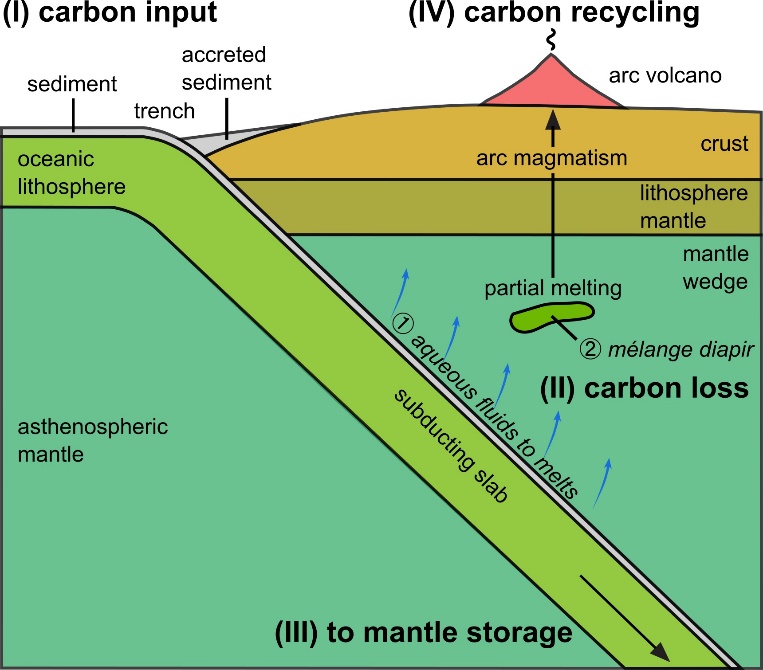 圖1. 以深部碳循環(huán)為視角的俯沖帶示意圖。碳通過多種途徑參與深部循環(huán):(I)沉積巖和大洋巖石圈(即地殼和巖石圈地幔)巖石向俯沖帶輸入碳。(II)在俯沖過程中,碳通過脫揮發(fā)分作用、溶解及部分熔融等方式從俯沖板塊中釋放。(III)部分碳被進(jìn)一步帶入地幔深處并儲存;(IV)一部分碳通過弧火山作用重新返回地表。需要注意的是,俯沖板片中碳的釋放可以用兩種端元模式來解釋。①傳統(tǒng)模式:認(rèn)為俯沖板塊釋放的流體和熔體導(dǎo)致地幔楔發(fā)生部分熔融,從而產(chǎn)生弧巖漿;②混雜巖(mélange)模式:認(rèn)為俯沖板塊的沉積物、蝕變洋殼和水化的地幔物理混合形成的混合巖,以底辟(diapirs)的形式上升到地幔楔,熔化后產(chǎn)生弧巖漿。
