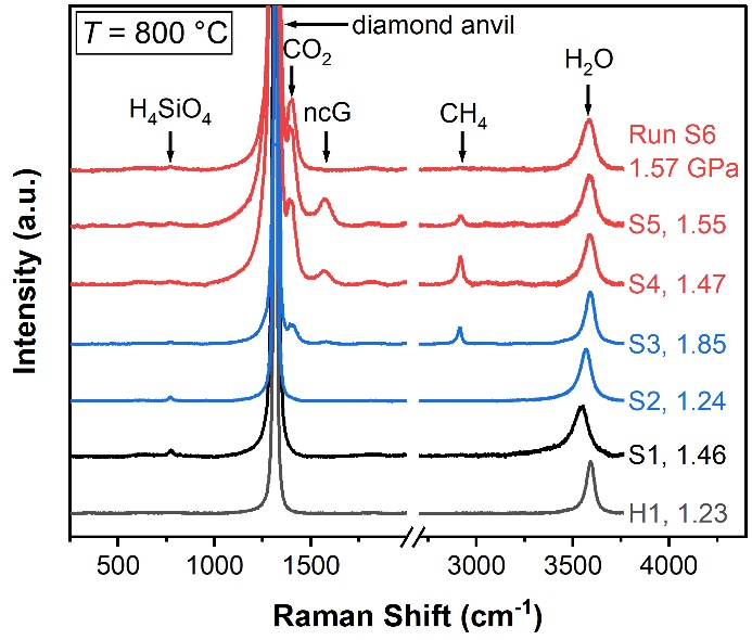圖2. 比較純H2O(H1實驗)、SiO2-H2O(S1實驗)和SiO2-COH(S2-6實驗)體系在800 ℃和約1.5 GPa下超過一小時的含水流體拉曼光譜。請注意,光譜的基線已校正,強(qiáng)度已根據(jù)近3600 cm-1處的H2O峰高進(jìn)行了歸一化處理。