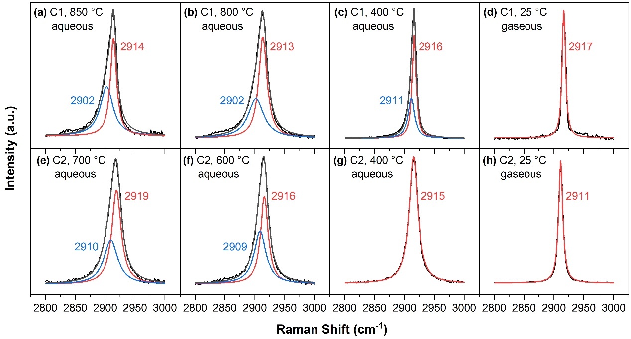 圖 3 2800-3000?cm-1波長區(qū)域內(nèi)從高溫到低溫還原的含CH4的含水流體和氣相的拉曼光譜擬合結(jié)果。在C1實驗中,鋯石被用作壓標(biāo)。800和850 ℃的拉曼光譜是在加熱過程中收集的,而400和25 ℃的光譜則是在達(dá)到最高溫度后冷卻過程中獲得的。在C2實驗中,沒有使用壓標(biāo),以消除潛在的硅酸鹽干擾。600和700 ℃的拉曼光譜是在加熱過程中采集的,而400和25 ℃的拉曼光譜是在達(dá)到最高溫度后冷卻過程中采集的。請注意,紅色曲線表示擬合的CH4主峰,藍(lán)色曲線表示擬合的肩峰。