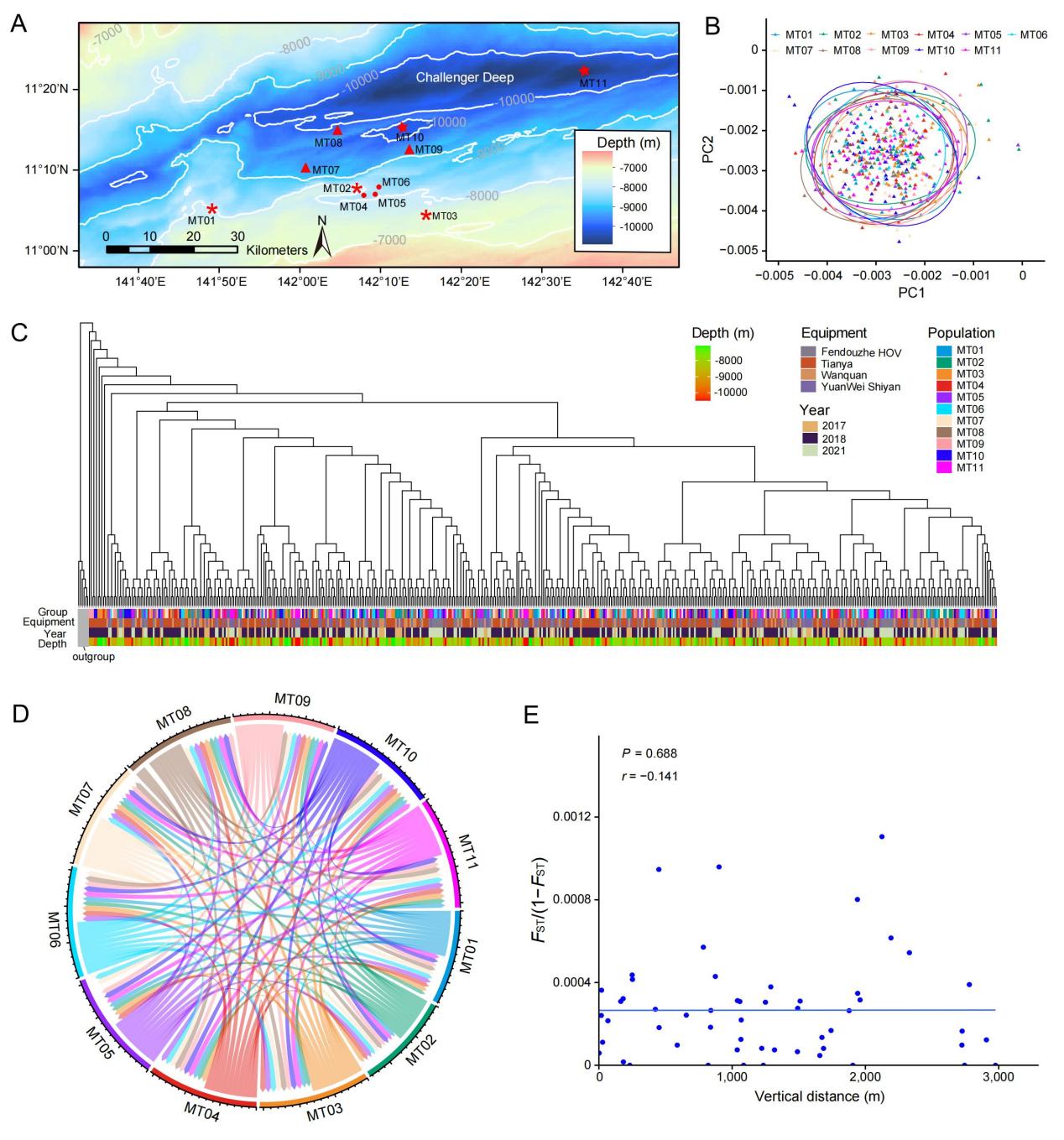 研究團(tuán)隊(duì)對(duì)馬里亞納海溝的510只(11個(gè)群體)、雅浦海溝94只(1個(gè)群體)及西菲律賓海盆深淵區(qū)的18只(1個(gè)群體)H. gigas個(gè)體進(jìn)行了高覆蓋的全基因組重測(cè)序和群體遺傳學(xué)分析。結(jié)果顯示來自馬里亞納海溝11個(gè)不同深度(~7000-11000米)群體不存在遺傳分化,表明生活在馬里亞納海溝內(nèi)的鉤蝦是一個(gè)完全混合的群體,高靜水壓不會(huì)限制其在海溝內(nèi)的垂直遷移。而西菲律賓海盆的鉤蝦群體與馬里亞納海溝的群體則表現(xiàn)出明顯的遺傳分化。這兩個(gè)海溝間相隔~1500公里,表明地理隔離阻礙了群體間的基因交流。