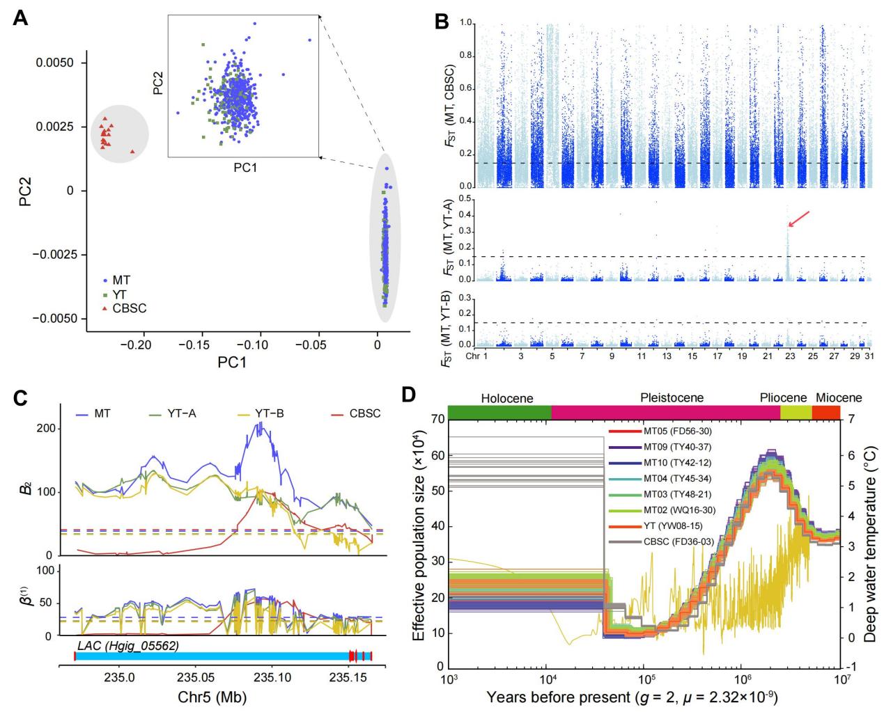 研究結(jié)果顯示H. gigas的有效種群在約100萬年前經(jīng)歷了一次急劇下降,這與更新世深海溫度的大幅波動(dòng)高度吻合。經(jīng)過遺傳瓶頸后,鉤蝦群體又經(jīng)歷了種群擴(kuò)張。這一結(jié)果說明,更新世時(shí)期大的冰期-間冰期氣候變化可能不僅造成了陸地動(dòng)物的大規(guī)模滅絕,而且也深刻影響了深海甚至深淵動(dòng)物。