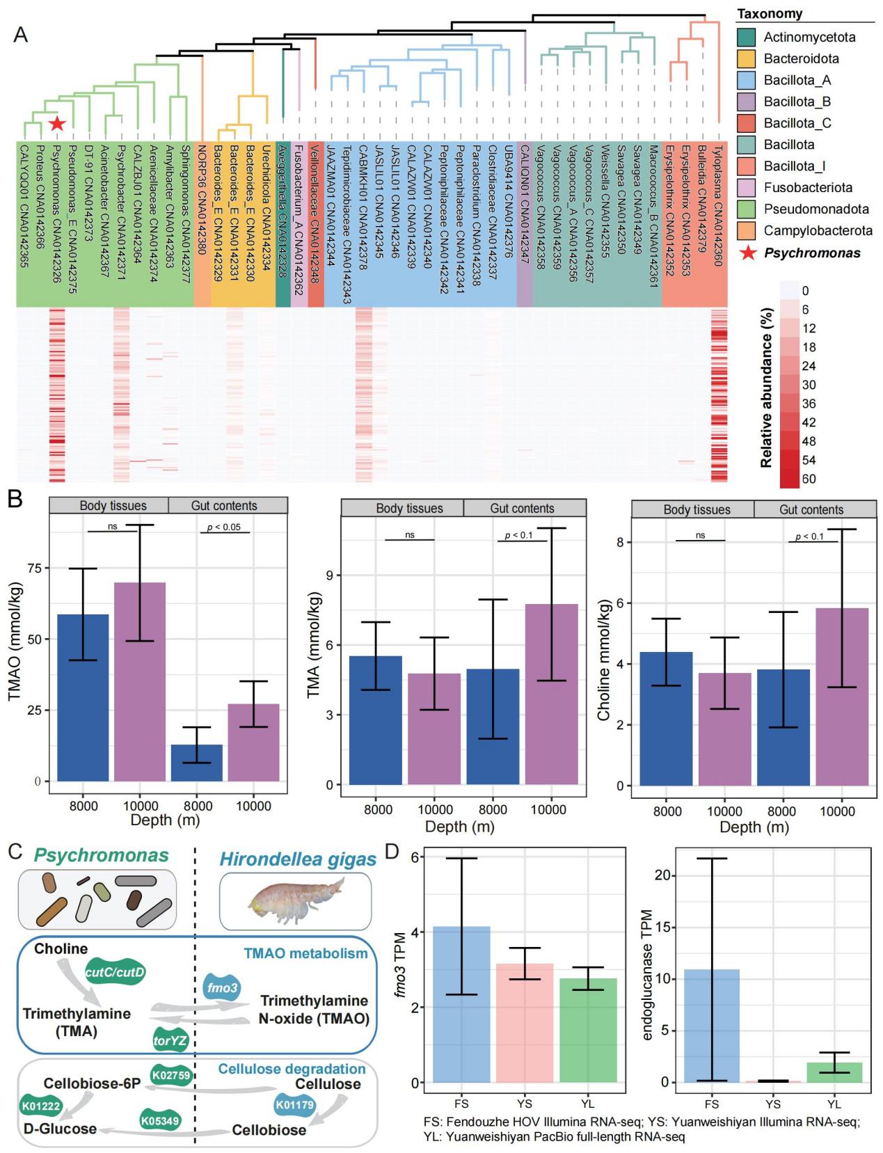 氧化三甲胺(TMAO)是一種滲透調(diào)節(jié)物質(zhì),在滲透壓調(diào)節(jié)以及在高靜水壓條件下維持細(xì)胞完整性方面發(fā)揮著重要作用。檢測(cè)發(fā)現(xiàn),隨著深度增加,鉤蝦腸道內(nèi)容物中TMAO濃度顯著升高,體組織中也呈現(xiàn)類似趨勢(shì)。鉤蝦自身編碼fmo3基因,可將三甲胺(TMA)轉(zhuǎn)化為TMAO。而其優(yōu)勢(shì)共生菌Psychomonas的基因組中攜帶cutC和cutD基因簇,可將膽堿分解為TMA;同時(shí)擁有torYZ操縱子,可以將TMAO還原為TMA,從而調(diào)控宿主體內(nèi)的TMAO濃度,形成動(dòng)態(tài)平衡。