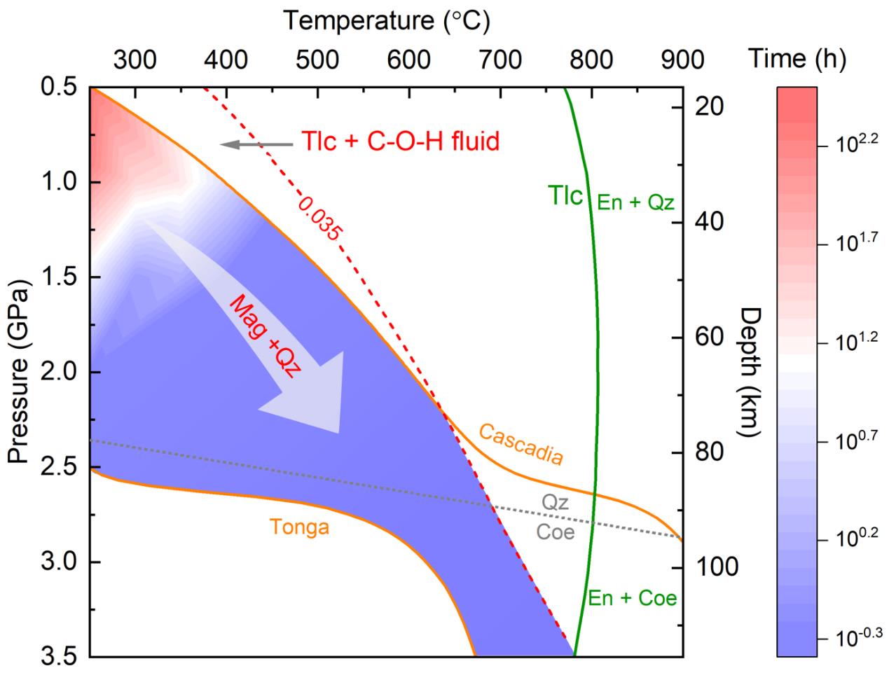 本研究采用金剛石壓腔(DAC)結(jié)合原位拉曼光譜技術(shù),系統(tǒng)研究了俯沖帶溫度壓力條件下滑石與C-O-H流體的碳酸化反應(yīng)過程。研究結(jié)果發(fā)現(xiàn)滑石在溫度> 250°C、壓力>1 GPa時(shí),可快速轉(zhuǎn)化為菱鎂礦與石英,有效地將流體中的CO2封存到新形成的熱力學(xué)更穩(wěn)定的菱鎂礦中,從而被挾帶進(jìn)入地球深部(見附圖)。此外,滑石碳酸化后還可能通過改變俯沖帶礦物組成,影響到包括地震活動(dòng)性在內(nèi)的動(dòng)力學(xué)過程。本研究的結(jié)果構(gòu)建了滑石碳酸化反應(yīng)的熱力學(xué)相圖,為更好地理解地球深部碳循環(huán)過程和受相變影響所致的地球動(dòng)力學(xué)行為提供了必要的實(shí)驗(yàn)約束。